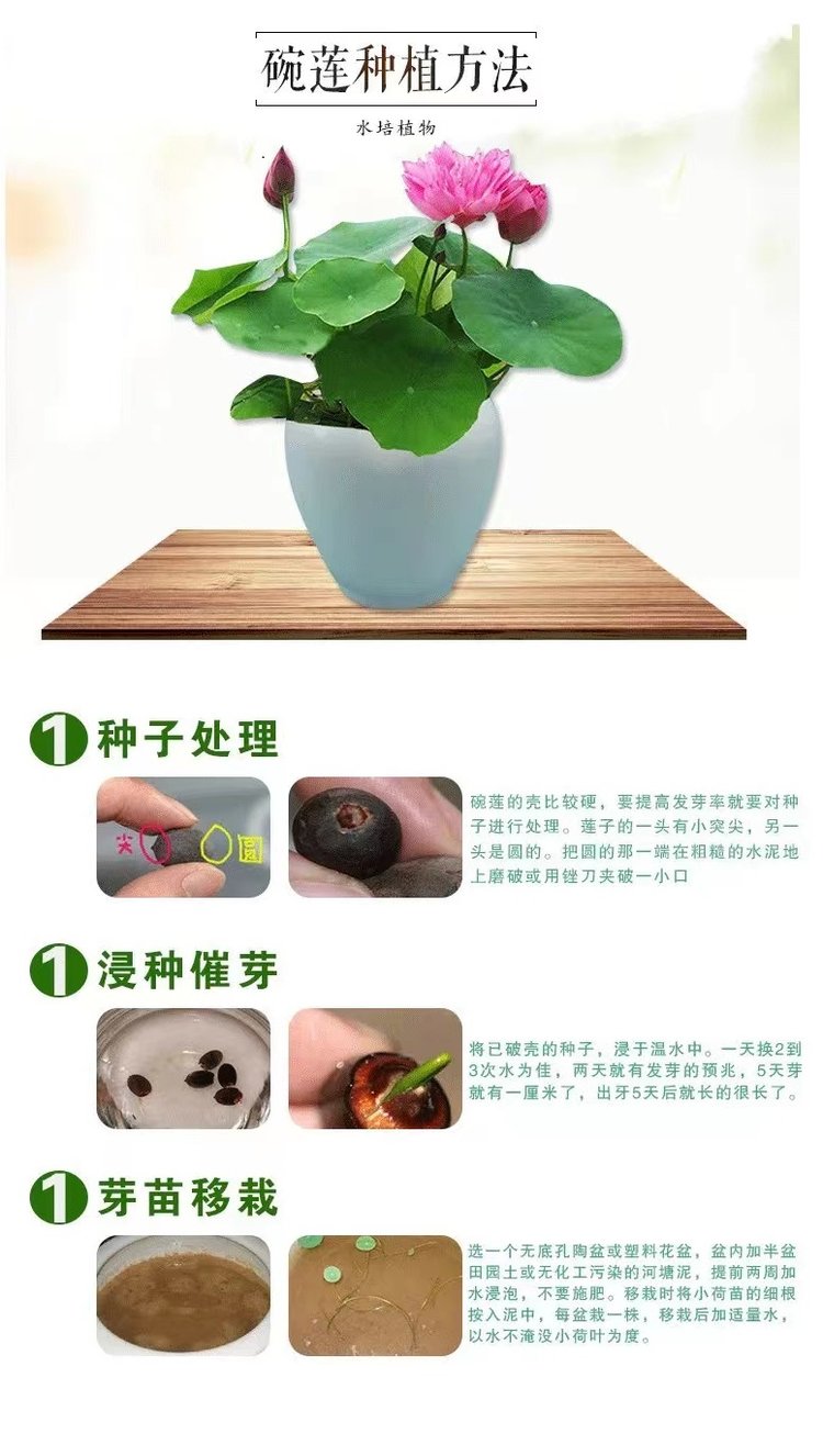 選擇健康、成熟的蓮花種子。成熟的種子會呈黑色或深褐色,并且具有完整的種皮和胚芽。準(zhǔn)備好種子后,將其浸泡在清水中,大概2-3天,每天更換水,直到種子表面的外殼軟化。